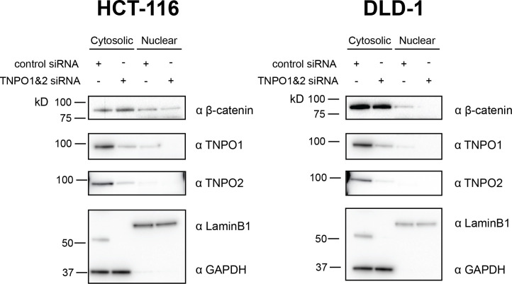 Figure 6—figure supplement 4. TNPO1/2 regulates nuclear β-catenin levels in colorectal cancer cells.Western blot demonstrating the efficacy of siRNA mediated Tnpo1 and Tnpo2 depletion on β-catenin nuclear and cytoplasmic levels in two colorectal cancer cell lines, HCT-116 and DLD-1. |