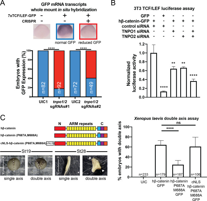 Figure 6 with 4 supplements TNPO1/2 and the β-catenin nuclear localization signal (NLS) are required for Wnt signaling in vivo. (A) Depletion of tnpo1 and tnpo2 using two different pairs of non-overlapping sgRNAs represses gfp expression in Xenopus tropicalis Tg(pbin7Lef-dGFP) embryos at stage 10. Key used to quantify embryos with whole mount in situ hybridization (WMISH) signal (blue – normal gfp signal nd red – reduced gfp signal). Uninjected control (UIC) embryos were used as a negative control. (B) siRNA mediated TNPO1 and/or TNPO2 knockdown reduces luciferase activity in mouse embryonic fibroblasts that harbor a stable integration of luciferase under the control of TCF/LEF promoters. Wnt signaling was activated by human β-catenin-GFP overexpression. Control siRNA and GFP were used as negative controls. Experiments were performed in triplicate. (C) Schematic diagram of three β-catenin constructs used in the double axis assay in Xenopus laevis. ** indicates P687A, M688A substitutions (top left). Dorsal views of X. laevis embryos with anterior to the top (bottom left). Dotted lines indicate the embryonic axis, and the white arrows indicate the head. Histogram of the percent of embryos with secondary axes from three independent replicates. p-Values are from Fisher’s exact test (A) and (C) and unpaired two-tailed t-test (B) where ns is p>0.05, p<0.05 (*), 0.0021 (**), 0.0002 (***), and p<0.0001 (****).The data is uploaded as Figure 6—source data 1. |
