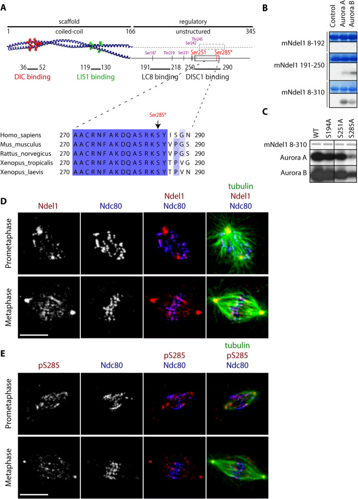 Dynein inactivates the spindle assembly checkpoint (SAC) by transporting checkpoint proteins away from kinetochores toward spindle poles in a process known as "stripping." We find that inhibition of Aurora A kinase, which is localized to spindle poles, enables the accumulation of the spindle checkpoint activator Mad1 at poles where it is normally absent. Aurora kinases phosphorylate the dynein activator NudE neurodevelopment protein 1 like 1 (Ndel1) on Ser285 and Mad1 accumulates at poles when Ndel1 is replaced by a nonphosphorylatable mutant in human cells. The pole focusing protein NuMA, transported to poles by dynein, also accumulates at poles in cells harboring a mutant Ndel1. Phosphorylation of Ndel1 on Ser285 is required for robust spindle checkpoint activity and regulates the poles of asters in Xenopus extracts. Our data suggest that dynein/SAC complexes that are generated at kinetochores and then transported directionally toward poles on microtubules are inhibited by Aurora A before they reach spindle poles. These data suggest that Aurora A generates a spatial signal at spindle poles that controls dynein transport and spindle function.