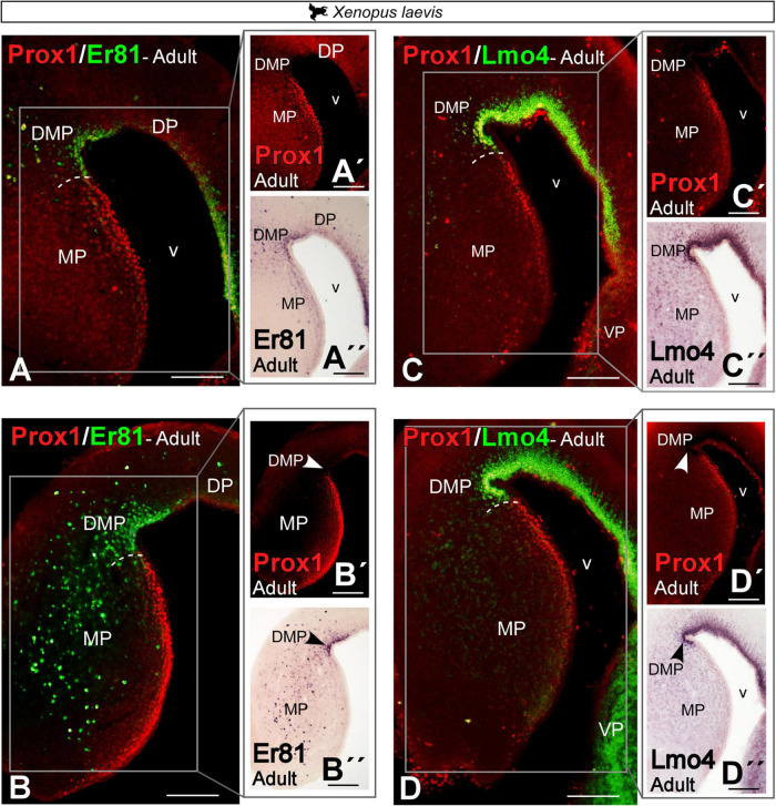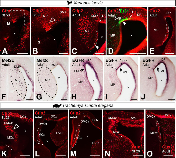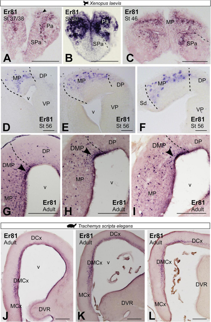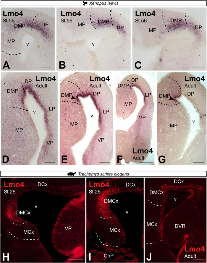 In all vertebrates, the most dorsal region of the telencephalon gives rise to the pallium, which in turn, is formed by at least four evolutionarily conserved histogenetic domains. Particularly in mammals, the medial pallium generates the hippocampal formation. Although this region is structurally different among amniotes, its functions, attributed to spatial memory and social behavior, as well as the specification of the histogenetic domain, appears to be conserved. Thus, the aim of the present study was to analyze this region by comparative analysis of the expression patterns of conserved markers in two vertebrate models: one anamniote, the amphibian Xenopus laevis; and the other amniote, the turtle Trachemys scripta elegans, during development and in adulthood. Our results show that, the histogenetic specification of both models is comparable, despite significant cytoarchitectonic differences, in particular the layered cortical arrangement present in the turtle, not found in anurans. Two subdivisions were observed in the medial pallium of these species: a Prox1 + and another Er81/Lmo4 +, comparable to the dentate gyrus and the mammalian cornu ammonis region, respectively. The expression pattern of additional markers supports this subdivision, which together with its functional involvement in spatial memory tasks, provides evidence supporting the existence of a basic program in the specification and functionality of the medial pallium at the base of tetrapods. These results further suggest that the anatomical differences found in different vertebrates may be due to divergences and adaptations during evolution.