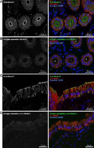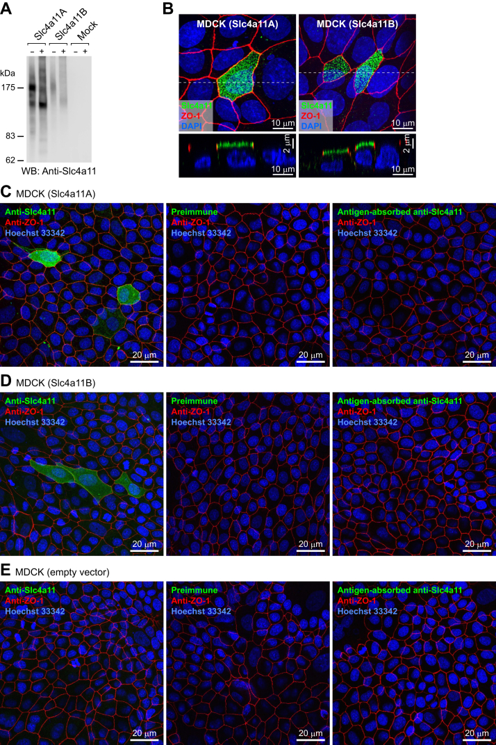 Figure 4. Validation of the antibody against Slc4a11. A, Western blot analysis of HEK293 cells transfected with pcDNA3 (mock), pcDNA3-Slc4a11A, or pcDNA3-Slc4a11B. The membrane fractions of the cells were incubated with (+) or without (–) glycosidases and analyzed using anti-Slc4a11 antiserum (left) and antigen-absorbed antiserum (right). B, polarized distribution of Slc4a11A and Slc4a11B in MDCK cells. Anti-Slc4a11 antiserum (green), anti-ZO-1 antibody (red), and Hoechst 33342 (blue) were used to stain MDCK cells transiently transfected with pcDNA3-Slc4a11A or pcDNA3-Slc4a11B. Confocal XY maximum projection image and XZ (vertical) sections are shown. C-E, anti-Slc4a11 antiserum (left panel), preimmune serum (center panel), or antigen-absorbed antiserum (right panel) (green) were used with anti-ZO-1 antibody (red) and Hoechst 33342 (blue) to stain MDCK cells transiently transfected with pcDNA3-Slc4a11A, pcDNA3-Slc4a11B, or pcDNA3 (mock). Confocal XY maximum projection images are shown. |