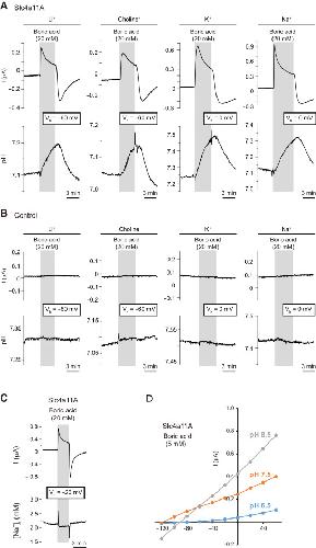 Figure 8. Ion-selective microelectrode analysis during Vmclamping and pH dependence of Na+-independent electrogenic boric acid transport activity of Slc4a11A. Representative traces of boric acid–elicited currents (holding potential Vh: −60 or 0 mV) and changes in intracellular pH of Slc4a11A (A) and control (B) oocytes. Oocytes were analyzed in ND96 (indicated by Na+) or similar media in which Na+ was replaced with Li+, choline, or K+. C, representative traces of boric acid–elicited currents (holding potential, −20 mV) and intracellular [Na+] of Slc4a11A oocyte. D, current–voltage (I–V) relationship of 5 mM boric acid–elicited currents in various pH conditions. Values are means (n = 4 to 5). Slc4, solute carrier family 4. |