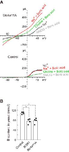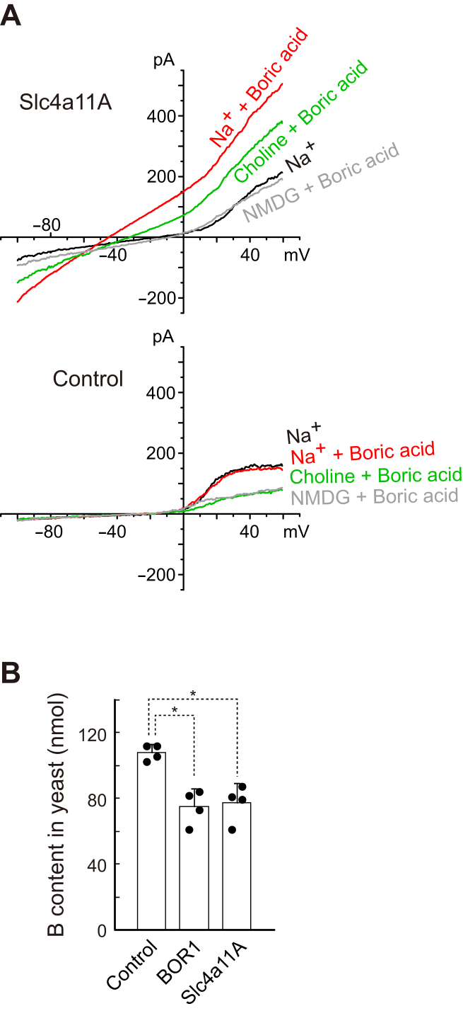 Figure 9. Activity of Slc4a11A in HEK293 and yeast cells. A, the whole-cell current was measured in untransfected HEK293 cells (control) or HEK293 cells expressing eGFP-Slc4a11A. The cells were incubated in a solution containing 20 mM boric acid and 145 mM Na+ or Na+-free media in which all Na+ was replaced with choline or NMDG. B, concentration of boron in the yeast cells expressing Slc4a11s or AtBOR1. Cells were incubated in a medium containing 20 mM boric acid; boron concentration in these cells was measured by ICP-MS. Dots represent individual data. Values are means ± SD. ∗p < 0.002. eGFP, enhanced GFP; HEK293, human embryonic kidney 293 cell line; ICP-MS, inductively coupled plasma mass spectrometry; NMDG, N-methyl-d-glucamine; Slc4, solute carrier family 4. |