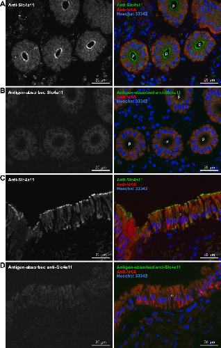 Figure 5. Immunolocalization of Slc4a11 in renal tubules of SW-acclimated river pufferfish. Serial frozen sections of mefugu kidney were stained with anti-Slc4a11 antiserum (A and C) or antigen-absorbed anti-Slc4a11 antiserum (B and D) (green), anti-Na+-K+-ATPase (NKA) antibody (red), and Hoechst (blue). Bars represent 20 μm. c, collecting duct; p, proximal tubule; Slc4, solute carrier family 4; SW, seawater. |