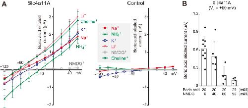 Figure 7. Voltage-clamp analyses of Na+-independent electrogenic boric acid transport activity of Slc4a11A. A, current–voltage (I–V) relationships of Slc4a11A or water-injected (control) oocytes in a solution containing 20 mM boric acid and various cations. Boric acid–elicited currents calculated by subtraction are shown (n = 3 to 6). B, dose-dependent inhibition of boric acid transport activity of Slc4a11A by NMDG. Boric acid–elicited currents of Slc4a11A oocytes (holding potential Vh: +60 mV) in the presence of various concentrations of NMDG are shown. Values are means ± SD (n = 4 to 10). NMDG, N-methyl-d-glucamine; Slc4, solute carrier family 4. |