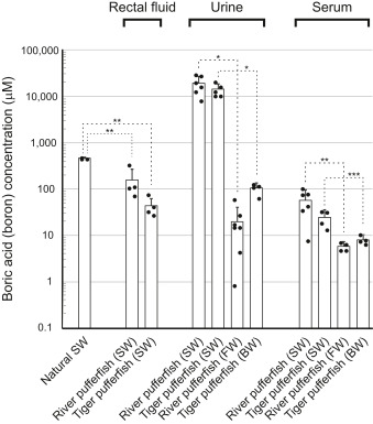 Figure 1. Urinary boric acid excretion by pufferfish in seawater (SW). Boric acid or boron concentrations of serum (n = 4–6), urine (n = 6–7), and rectal fluid (n = 4) of pufferfish acclimated to brackish water (BW), fresh water (FW), and natural SW are shown. Dots represent individual data. Bar graphs represent means ± SD. ∗p < 0.0001, ∗∗p < 0.0002, and ∗p < 0.05. |