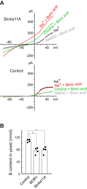 Figure 9. Activity of Slc4a11A in HEK293 and yeast cells.A, the whole-cell current was measured in untransfected HEK293 cells (control) or HEK293 cells expressing eGFP-Slc4a11A. The cells were incubated in a solution containing 20 mM boric acid and 145 mM Na+ or Na+-free media in which all Na+ was replaced with choline or NMDG. B, concentration of boron in the yeast cells expressing Slc4a11s or AtBOR1. Cells were incubated in a medium containing 20 mM boric acid; boron concentration in these cells was measured by ICP-MS. Dots represent individual data. Values are means ± SD. ∗p < 0.002. eGFP, enhanced GFP; HEK293, human embryonic kidney 293 cell line; ICP-MS, inductively coupled plasma mass spectrometry; NMDG, N-methyl-d-glucamine; Slc4, solute carrier family 4. |