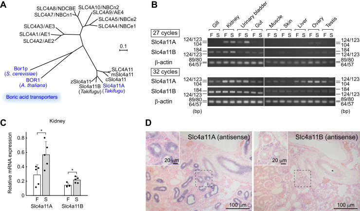 Figure 2. Renal expression of Slc4a11A. A, phylogenetic tree of boric acid transporters in relation to the other human SLC4 family members. The boric acid transport activity of Takifugu Slc4a11A is shown in this study. The scale bar represents 0.1 amino acid substitution per site. B, tissue distribution of Slc4a11A and Slc4a11B. Semiquantitative RT–PCR was performed on various tissues of river pufferfish. Numbers indicate PCR cycles. Results from 27 PCR cycles show tissues with relatively high expression of the indicated genes, and those of 32 cycles show all tissues expressing the indicated genes from low to high levels (111, 162, 65). C, real-time PCR quantification of mRNAs for Slc4a11A and Slc4a11B in the kidneys of river pufferfish acclimated to FW and SW. Values are expressed relative to GAPDH. Dots represent individual data. Bar graphs represent means ± SD, n = 5. ∗p < 0.05. D, in situ hybridization of Slc4a11A and Slc4a11B in the kidney of river pufferfish in SW. Sense probes did not show labeling (data not shown). AE, anion exchanger; c, chicken; F, FW; NBC, Na+-HCO3– cotransporter; NDCBE, Na+-driven Cl–/HCO3– exchanger; S, SW; SLC4, solute carrier family 4; z, zebrafish. |