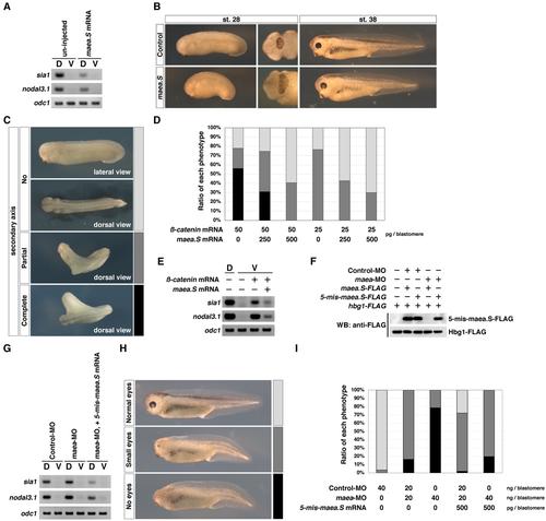 Figure 3. Effects of ß-catenin on head and secondary axis formation by maea.S. (a) RT-PCR analysis of the dorsal or ventral sectors from embryos (st. 10) injected with maea.S mRNA. D, dorsal sectors. V, ventral sectors. (b) Phenotypes of embryos when injected with maea.S mRNA into animal dorsal blastomeres at the 8-cell stage. The appearance rate of embryos with enlarged head structures was 68.1% (n = 47). Central panels indicate enlarged images of the cement gland region. (c) Phenotypes of embryos (st. 30) when injected with ß-catenin mRNA or co-injected with maea.S mRNA into ventral blastomeres at the 4-cell stage. Each injected embryo had no secondary axis, a partial secondary axis without a head structure, or a complete secondary axis with a head structure. Views are indicated at the bottom of the images. (d) The appearance rates of phenotypes in Figure 3c. No secondary axis (light gray); partial secondary axis (dark gray); complete secondary axis (black). Injected mRNA amounts are indicated at the bottom of the graph. Lane 1: n = 50, no secondary axis (22.0%), partial secondary axis (22.0%), and complete secondary axis (56.0%). Lane 2: n = 55, no secondary axis (25.5%), partial secondary axis (43.6%), and complete secondary axis (30.9%). Lane 3: n = 59, no secondary axis (59.3%) and partial secondary axis (40.7%). Lane 4: n = 34, no secondary axis (23.5%) and partial secondary axis (76.5%). Lane 5: n = 35, no secondary axis (57.1%) and partial secondary axis (42.9%). Lane 6: n = 40, no secondary axis (70.0%) and partial secondary axis (30.0%). (e) RT-PCR analysis of the ventral sectors from embryos injected with ß-catenin mRNA (50 pg/blastomere) or co-injected with maea.S mRNA (500 pg/blastomere). The un-injected dorsal sectors were used as a positive control. (f) WB analysis. The indicated mRNAs and MOs were injected, and FLAG-tagged hemoglobin subunit gamma 1, hbg1-FLAG mRNA was co-injected as loading control. (g) RT-PCR analysis of the dorsal or ventral sectors from embryos injected with Control-MO (40 ng/blastomere), maea-MO (40 ng/blastomere), or co-injected with 5-mis-maea.S mRNA (500 pg/blastomere). (h) Phenotypes of embryos when injected with maea-MO or co-injected with 5-mis-maea mRNA into animal dorsal blastomeres at the 8-cell stage. Each injected embryo was categorised as having normal eyes, small eyes, or no eyes. The centre panel shows a representative example of the weak phenotype of embryos rescued by co-injection of 5-mis-maea mRNA. The bottom panel shows a representative example of the severe phenotype of embryos injected with maea-MO. (i) The appearance rates of phenotypes in Figure 3h. Normal eyes (light gray); small eyes (dark gray); no eyes (black). Injected mRNAs and MO amounts are indicated at the bottom of the graph. Lane 1: n = 59, normal eyes (96.6%) and small eyes (3.4%). Lane 2: n = 55, small eyes (83.6%) and no eyes (16.4%). Lane 3: n = 56, small eyes (21.4%) and no eyes (78.6%). Lane 4: n = 54, normal eyes (1.9%), small eyes (70.4%), and no eyes (27.7%). Lane 5: n = 51, normal eyes (19.6%) and small eyes (80.4). |