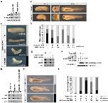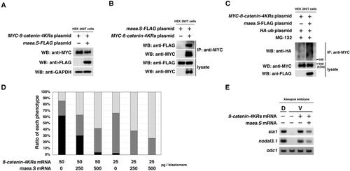 Figure 4. Inhibition effects of maea.S on the ß-catenin-4KRs construct. (a) WB of ectopically expressed ß-catenin-4KRs in HEK 293 T cells. Indicated plasmids were transfected, and indicated antibodies were used. (b) Interaction between ectopically expressed Maea.S and ß-catenin-4KRs in HEK 293 T cells. (c) WB of ubiquitinated ß-catenin-4KRs treated as described in Figure 2e. (d) The appearance rates of embryo phenotypes when injected with ß-catenin-4KRs mRNA or co-injected with maea.S mRNA into ventral blastomeres at the 4-cell stage (see Figure 3c,d). No secondary axis (light gray); partial secondary axis (dark gray); complete secondary axis (black). Injected mRNA amounts are indicated at the bottom of the graph. Lane 1: n = 85, no secondary axis (14.1%), partial secondary axis (23.5%), and complete secondary axis (62.4%). Lane 2: n = 82, no secondary axis (36.6%), partial secondary axis (32.9%), and complete secondary axis (30.5%). Lane 3: n = 83, no secondary axis (57.8%), partial secondary axis (38.6%), and complete secondary axis (3.6%). Lane 4: n = 80, no secondary l axis (33.8%), partial secondary axis (63.8%), and complete secondary axis (2.4%). Lane 5: n = 81, no secondary axis (61.7%) and partial secondary axis (38.3%). Lane 6: n = 80, no secondary axis (73.8%) and partial secondary axis (26.3%). (e) RT-PCR analysis of the ventral sectors of embryos injected with ß-catenin-4KRs mRNA (50 pg/blastomere) or co-injected with maea.S mRNA (500 pg/blastomere). The un-injected dorsal sectors were used as the positive control. |