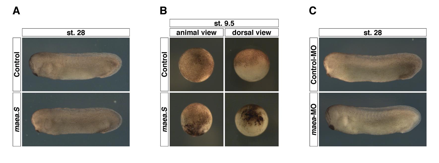 Supplemental Figure 1. Phenotypes of the injected embryos. The appearance rate (%) of phenotype and the number of the examined embryos (n) are indicated. (A) Phenotypes of embryos injected dorsally with maea.S mRNA-injected (500 pg/blastomere) (st. 28). No significant phenotype was observed, 100% (n=58). (B) The injection of a large amount of maea.S mRNA (2 ng/blastomere) led blastomere’s death before late blastula stage (st. 9.5), 100% (n=38). (C) Phenotypes of embryos injected dorsally with maea-MO-injected (40 ng/blastomere) (st. 28). No significant phenotype was observed, 100% (n=56). |