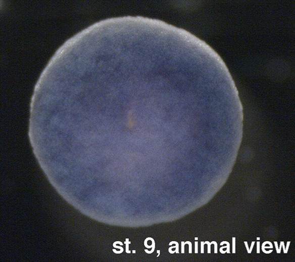 maea (macrophage erythroblast attacher) gene expression in X. laevis embryo, NF stage 9, as assayed via in situ hybridization, animal view. |