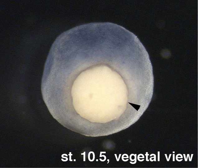 maea (macrophage erythroblast attacher) gene expression in a X. laevis embryo, NF stage 10.5, as assayed via in situ hybridization, vegetal view, dorsal up. |