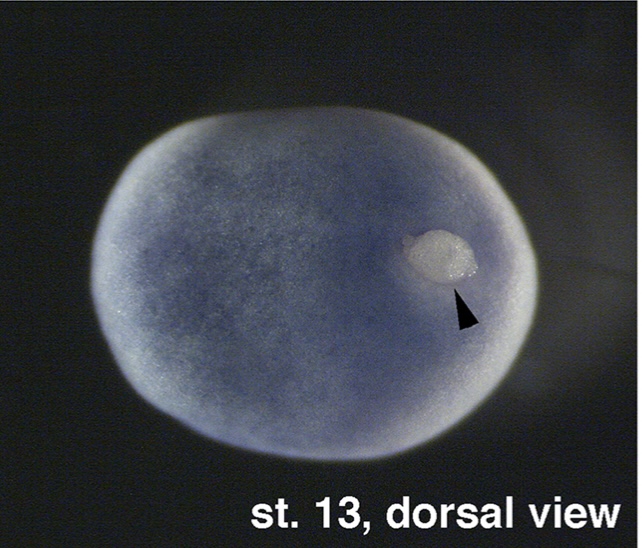 maea (macrophage erythroblast attacher) gene expression in X. laevis embryo, NF stage 13, as assayed via in situ hybridization, dorsal view, anterior left. |