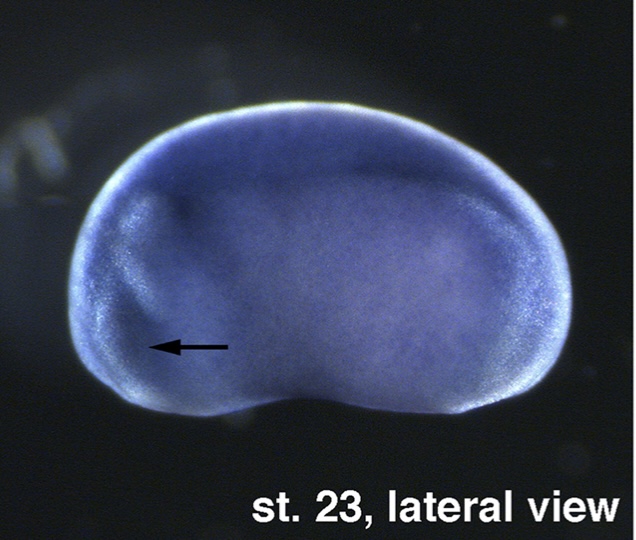 maea (macrophage erythroblast attacher) gene expression in X. ;aevis embryo, NF stage 23, as assayed via insitu hybridization, lateral view, anterior left, dorsal up. |