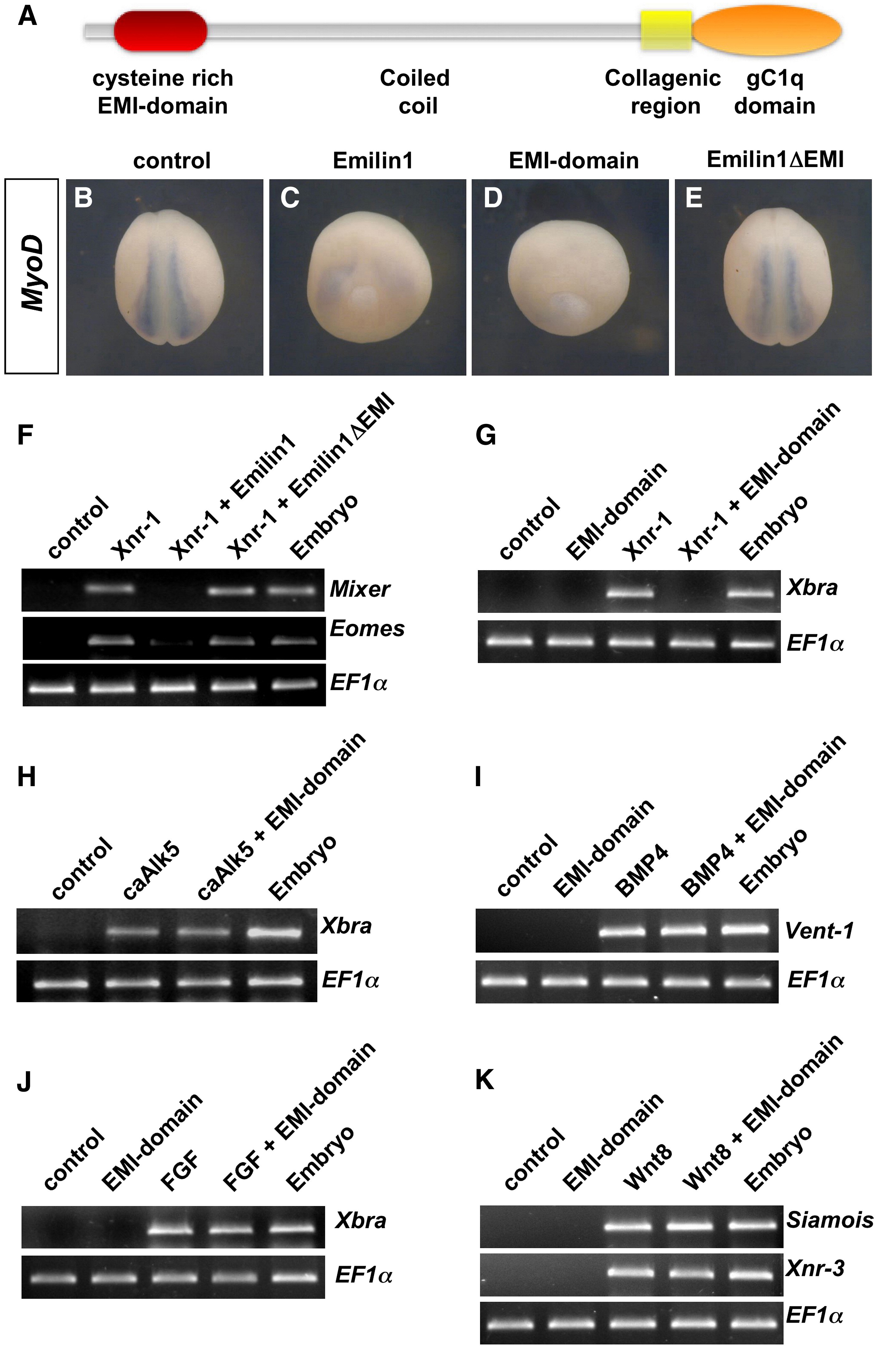 Figure 2. Emilin1 Inhibits Nodal/TGF-β Signaling through the EMI Domain(A) Schematic representation of the structure of Emilin1 protein. The EMI domain at the N terminus is a cysteine-rich region distinctive of the EDEN protein family.(B�E) Overexpression of Emilin1 attenuates mesoderm development in Xenopus embryos through the EMI-domain. Eight cell-stage embryos were injected in the marginal zone with mRNAs encoding for full-length Emilin1 (2 ng) (C), EMI-domain alone (400 pg) (D), or a deleted version of Emilin1 (2 ng, Emilin1δEMI) lacking the EMI-domain (E). The embryos were processed by in situ hybridization for the paraxial mesoderm marker MyoD. Similar results were obtained by staining gastrula stage embryos with the pan-mesodermal marker VegT (Figure S2).(F and G) Emilin1 inhibits nodal/TGF-β signaling, and this requires the EMI-domain. Two cell-stage embryos were injected in the animal pole with the indicated mRNAs. Animal caps were explanted at stage 9 and harvested at stage 11 for RT-PCR analysis. (F) Activation of the mesoderm markers Eomes and Mixer by Xnr-1 mRNA (60 pg) is antagonized by Emilin1 mRNA but not by Emilin1δEMI mRNA. (G) Overexpression of EMI-domain mRNA is sufficient to inhibit mesoderm induction by coinjected Xnr-1. As shown in Figure S2, induction of ectopic bottle cells or axial structures, typical effects of TGF-β/Nodal/Smad signaling, is also antagonized by Emilin1.(H) RT-PCR of animal caps explanted from embryos injected as in (F) with constitutive-active (ca)-TGF-β type I receptor (Alk5) mRNA (100 pg) alone or in combination with EMI-domain mRNA (800 pg). Emilin1 acts upstream of TGF-β receptor activity.(I�K) Embryos were injected as in (F) with EMI-domain mRNA (800 pg) in combination with BMP2, eFGF, or Xwnt8 mRNAs (100 pg, 2 pg, and 20 pg, respectively). Explanted animal caps were analyzed by RT-PCR for the indicated markers. EF1α serves as loading control.
