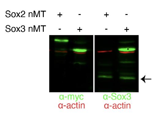 Fig. S1. Western blot of embryos at blastula stage expressing myc-tag Xenopus Sox2 or Sox3. Left blot is using the myc 9E10 monoclonal antibody (Green) and anti actin for loading control (Red). The right blot is performed using the anti Sox3 antibody (DA5H6sox3, Green). Note that the upper band corresponding to Sox2 is not recognized by mAb DA5H6sox3.