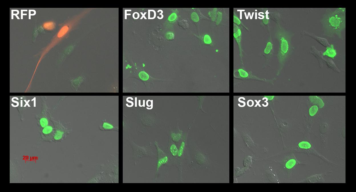 Fig. 1. Immunofluorescence testing of serum. The serum from mouse M3 immunized with FoxD3-Flag, Twist-Flag, Six1-Flag, Slug-Flag and Sox3-Flag produced in Hek293T cells was tested by immunofluorescence on XTC cells transfected with each of the target or RFP-Flag as a negative control. A secondary Alexa 488-conjugated anti-mouse antibody was used to visualize the mouse primary antibodies (green). Notice the green nuclei in each of the transfections, with some non-transfected cells lacking signal.