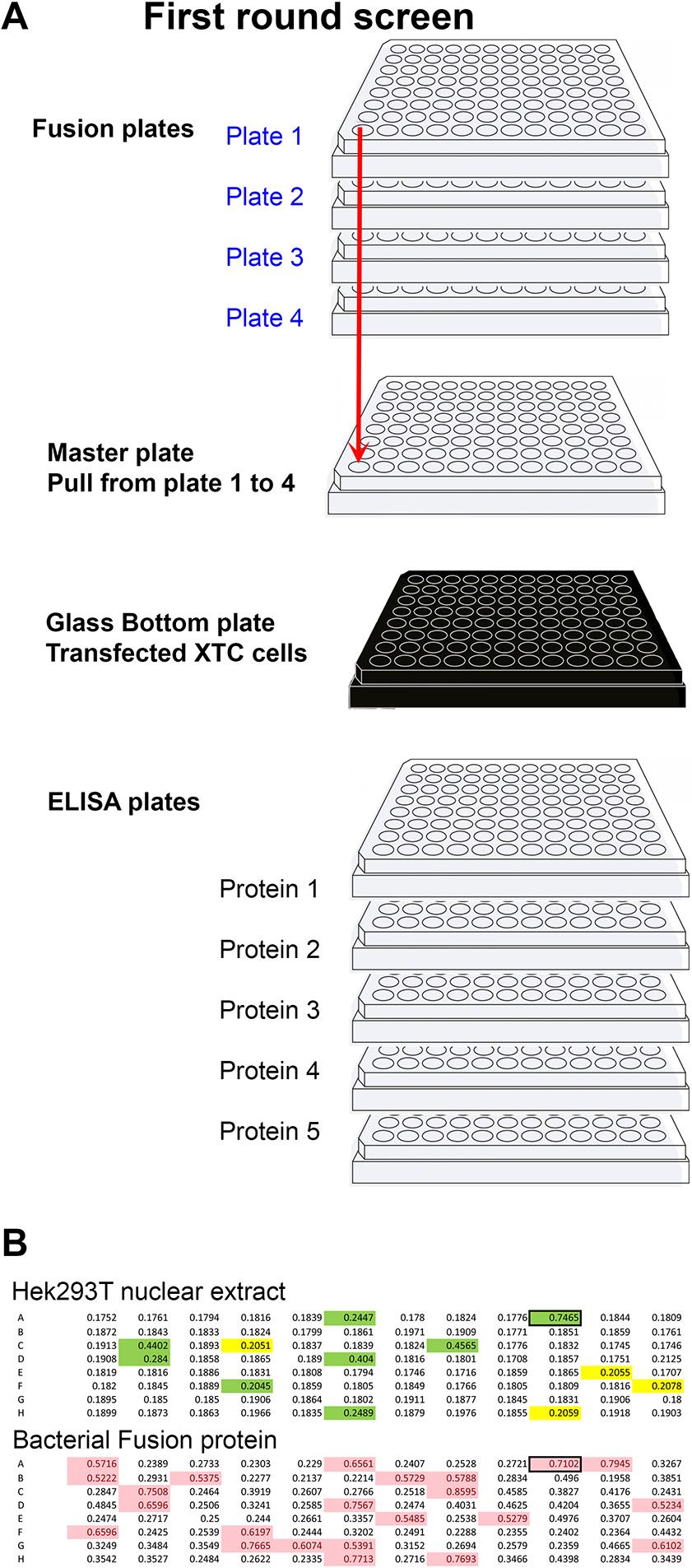Fig. 2. Primary screening method. (A) Diagram representing the strategy used to rapidly identify wells producing antibodies to multiple targets at once. Four plates per fusion were used. Thirty microlitres were taken from each well and placed in the master plate (total volume 120 µl). The master plate was diluted with 200 µl of TBST (TBS with 0.1% Tween 20). From the 320 µl of the master plate, 50 µl was added to each of the five ELISA plates plus the glass-bottom plate containing XTC cells transfected with each of the five targets. Simultaneously, 50 µl of supernatant was added to each well of five ELISA plates, each coated with individual proteins. Wells positive in either or both assays (A1 to H12) were then tested on each of the original plates (blue) to identify the plate number (deconvolution, 1A1 to 4H12). (B) Primary screen by ELISA using the cytoplasmic domain of Adam13/33 expressed in Hek293T cells (top) and his-tag bacterial fusion protein (bottom). The mice were immunized using the bacterial fusion protein. Highlighted wells are above the chosen background (0.2 for Hek293T and 0.5 for bacterial fusion protein). Wells highlighted in green are common to both ELISA and were selected for further screening.
