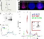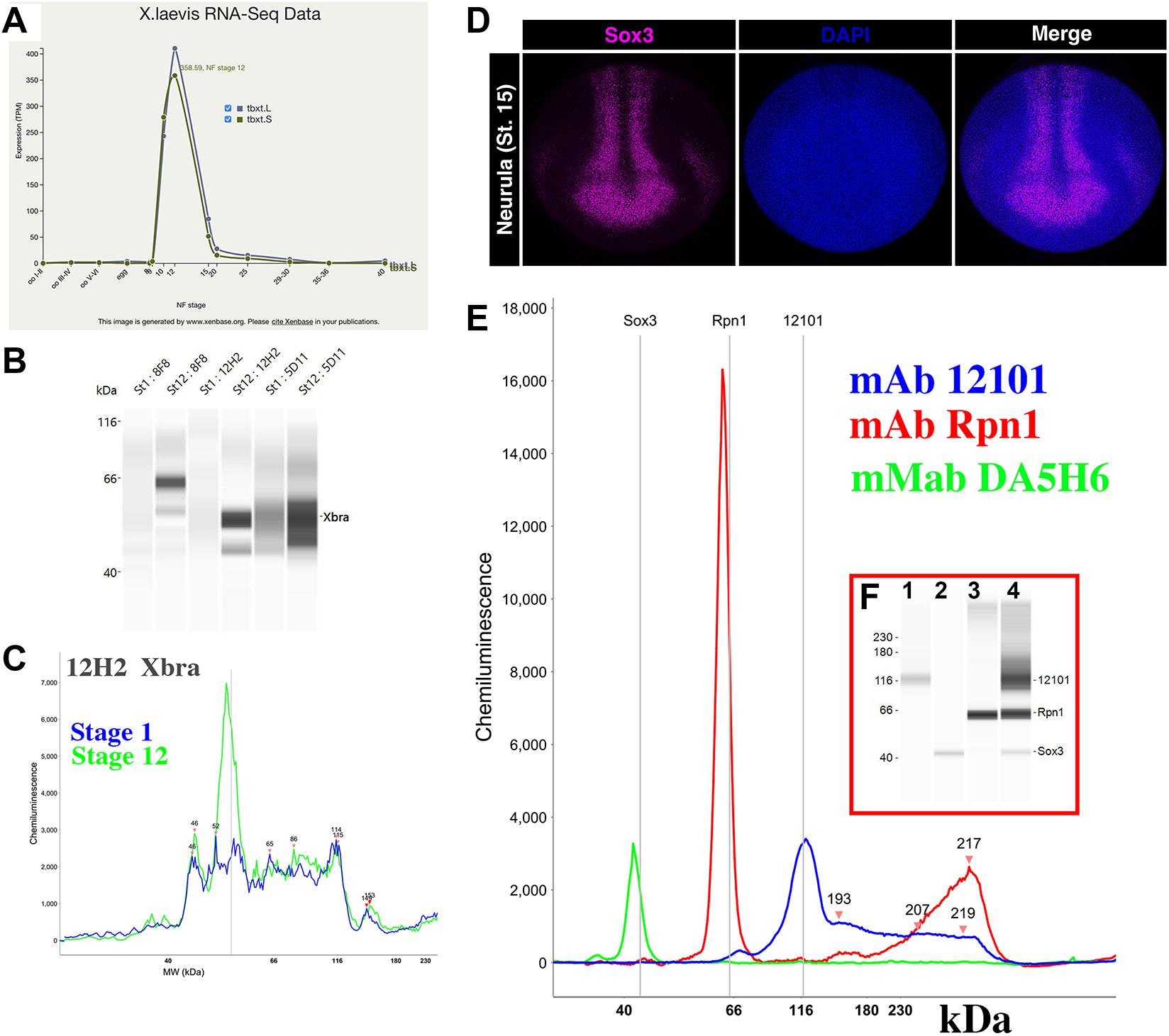 Fig. 4. Secondary screening. (A) RNA-sequencing (RNA-Seq) expression data for Xenopus brachyury (tbxt) from Xenbase. No mRNA is detected for this gene at stage 1 (fertilized egg), but it is strongly expressed during gastrulation (stage 12). (B) Capillary western blot (0.04 embryo equivalent) at stage 1 and stage 12 for three independent hybridomas (8F8, 12H2, 5D11). Note that bands are visible only at stage 12. (C) Signal intensity of the chemiluminescence for clone 12H2 at stages 1 and 12. Note that a single peak is present in stage 12 (green), but not stage 1 (blue), but the background signal is similar. (D) Whole-mount immunofluorescence of a neurula stage embryo. Sox3 is in magenta, and DAPI (to stain nuclei) is in blue. MAb DA5H6sox3 detects the nuclei of cells within the neural plate. (E,F) Chemiluminescence signal (E) from a capillary western blot (F) of embryo extracts (0.04 embryo equivalent per lane) incubated with antibodies to Sox3 (green), Ribophorin1 (Rpn1, red) and the muscle marker 12101 (blue). Antibodies were incubated either separately (lanes 1-3) or together (lane 4).