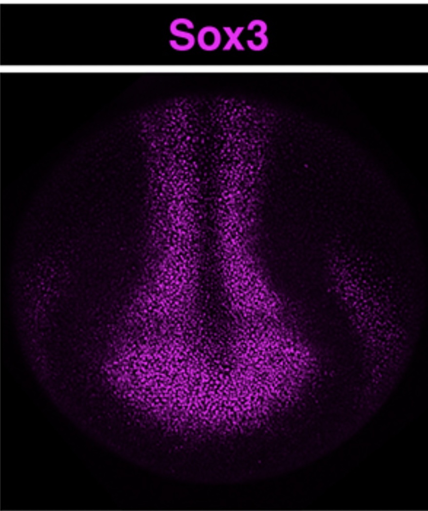 sox3 (SRY-box 3) gene expression in Xenopus laevis embryo, neurula stage NF 17-18, assayed via immunohostochemistry, anterior view, dorsal up.