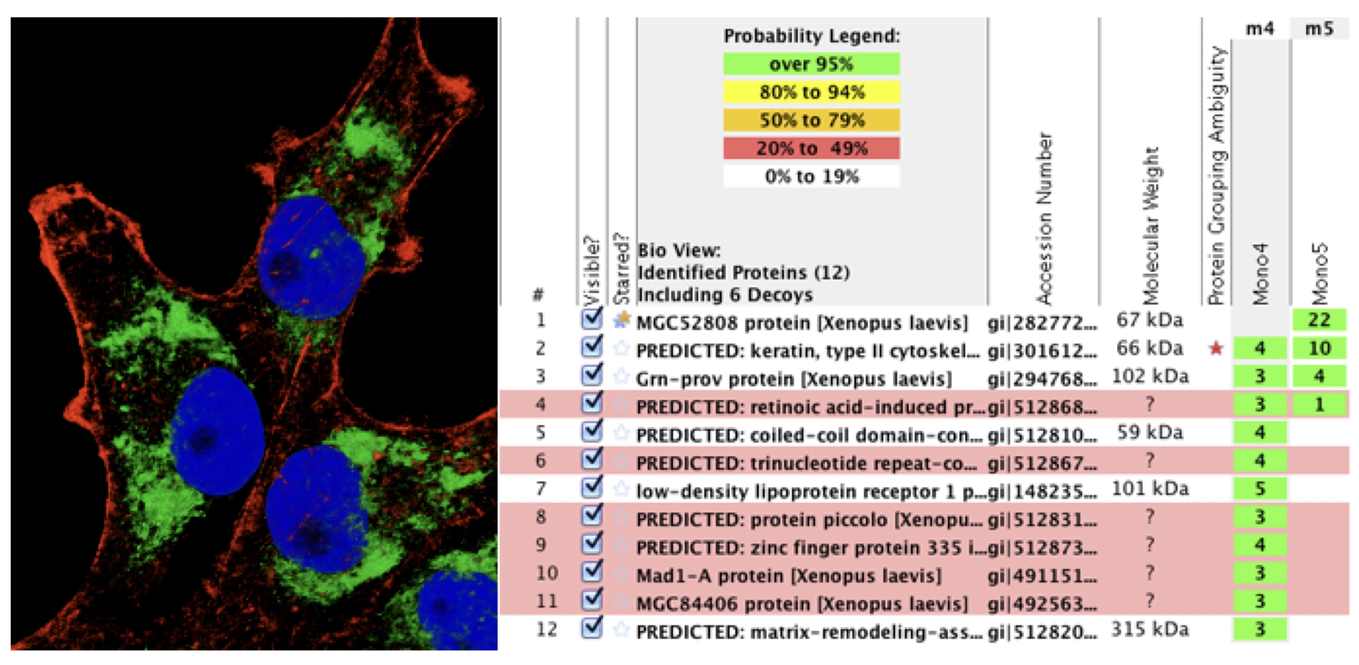 Fig. S2. Characterization of the Rpn1 antibody (Mono5, m5) by Immunofluorescence (Left, green) and Immunoprecipitation followed by Mass spectrometry (Right). The nuclei are labelled with (DAPI) and the actin cytoskeleton is in red (Phalloidin). The main protein pulled down by m5 not pulled down by another mAb (m4) is MGC52808 (ribophorin 1/Rpn1), an ER resident protein.