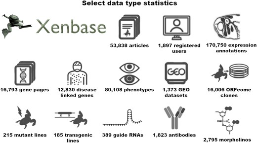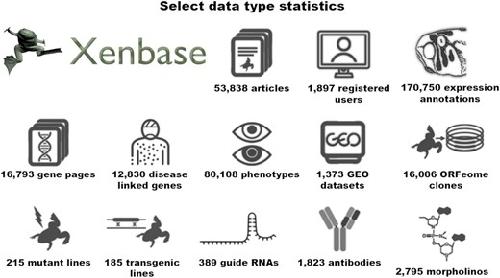 Xenbase data summary statistics. This infographic shows statistics for several key Xenbase data types.