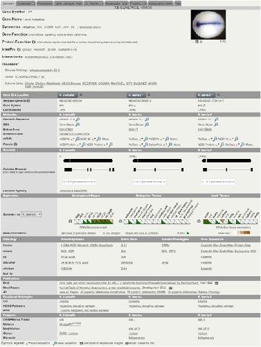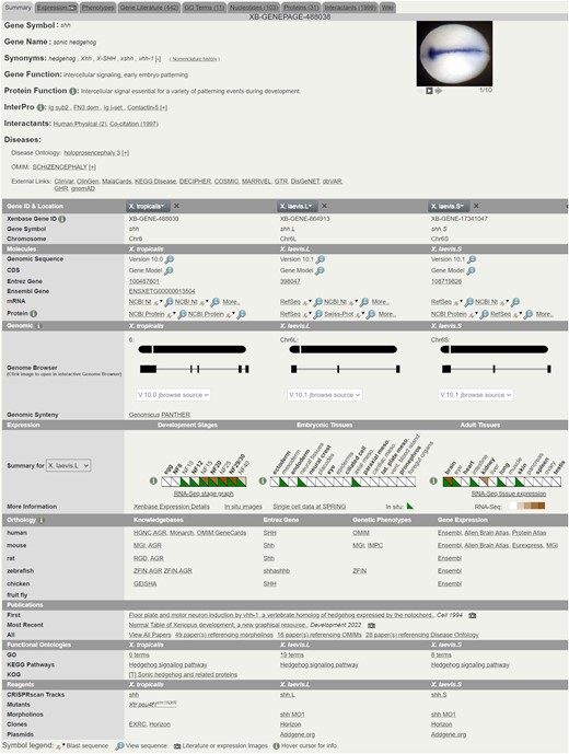 Xenbase gene page layout. The top section of the Gene Page shows a brief overview of relevant data and links to both more detailed Xenbase pages and external resources. Tabs switch to further gene-specific data on the relevant topics. The lower sections provide species-specific data for X. tropicalis and X. laevis including graphical summaries of genomic position and gene expression. This example is for the shh gene (https://www.xenbase.org/entry/XB-GENE-488038).