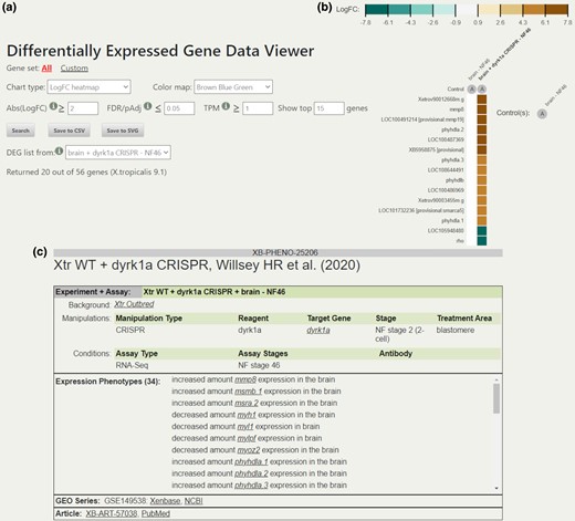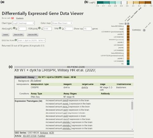 GEO expression data and phenotypes. a) GEO heatmap visualization parameter options as our automated expression pipeline, the values here are the same as those used to derive computational expression phenotypes. b) Heatmaps showing samples from a control brain and a brain from a CRISPR knockdown of dyrk1a. The color map is scaled to the highest absolute value of the maximum and minimum values of the genes displayed. c) An XB-PHENO page displaying part of the corresponding computationally derived expression phenotypes. This differs from the manual XB-PHENO page layout, see Fig. 6c, in the lack of accompanying image and additional links to the Xenbase and NCBI pages for the original GEO series and research article (Willsey et al. 2020). The phenotype data shown here are available at https://www.xenbase.org/entry/XB-PHENO-25206.