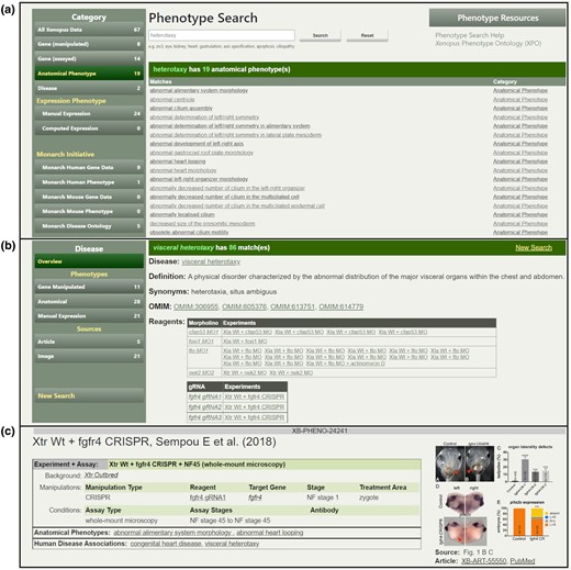 Phenotype search and XB-PHENO pages. a) The Xenbase Phenotype Search interface takes terms that are genes, anatomical entities, GO terms, and diseases and allows for partial matches. Searches can be filtered either before or after the search is run by selecting one of the categories in the left-hand sidebar. Results are also shown from the Monarch Initiative for humans and mice. In this example, results are shown for the partial DO term “heterotaxy”. b) An example result page for a Disease Ontology term search. This page shows counts for different categories of phenotype data associated with models of “visceral heterotaxy.” The default display shows descriptive information about the disease and a summary of experimental reagents used in models of the disease. c) XB-PHENO page showing anatomical phenotype and disease annotations. The layout has a heading summary with a brief experiment description and the source reference, a description of the experiment and assay details in a table, the phenotype terms and statements, and a thumbnail of the source image to the right-hand side. This example shows phenotype curation for a CRISPR experiment modeling visceral heterotaxy and congenital heart disease (Sempou et al. 2018). The phenotype data shown here are available at https://www.xenbase.org/entry/XB-PHENO-24241.