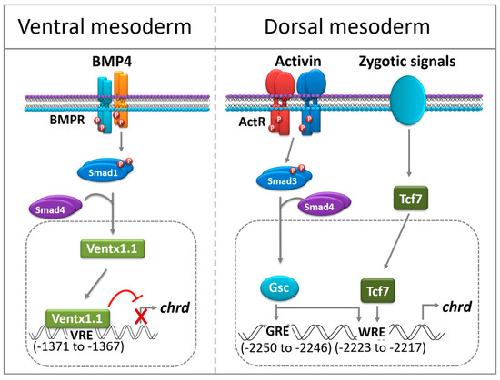 Smad2 and Smad3 differentially modulate chordin transcription via direct binding on the distal elements in gastrula Xenopus embryos.