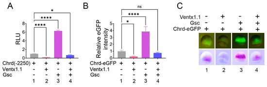 Figure 2. The chrd(-2250) promoter region contains the positive and negative response elements for Gsc and Ventx1.1., respectively. (A) chrd(-2250) was injected with or without gsc (1 ng/embryo) and ventx1.1 (1 ng/embryo) at the one-cell stage. The luciferase reporter gene assay was performed at stage 11. (B) The quantification of eGFP relative fluorescence was analyzed with the embryos shown in (C). The chrd(-2250)eGFP was injected with or without gsc (1 ng/embryo) and ventx1.1 (1 ng/embryo) at the one-cell stage, and fluorescent analysis was performed at stage 10.5. ). * p ≤ 0.1, **** p ≤ 0.0001, and n.s. denotes nonsignificant values.