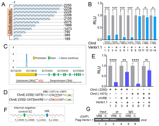 Figure 3. chrd promoter contains VRE. (A) Schematic representation of serially deleted chrd promoter constructs. (B) Relative luciferase activity of serially deleted chrd promoter constructs with or without Ventx1.1. (C) ChIP-sequencing coverage plot of Ventx1.1 within the chrd promoter region. (D) Schematic representations of site-directed mutagenesis and targeted nucleotides are italicized, underlined, and shown in red. (E) Relative luciferase activities of chrd(-2250), chrd(-2250)mVRE, chrd(-1473), and chrd(-1473)mVRE, with or without Ventx1.1. (F) The location of designed primers for VRE and the internal negative control (C). (G) Chromatin immunoprecipitation (ChIP) assay was performed to test the occupancy of Ventx1.1-Flag to VRE within the promoter region of chrd. ** p ≤ 0.01, **** p ≤ 0.0001, and n.s. denotes nonsignificant values.