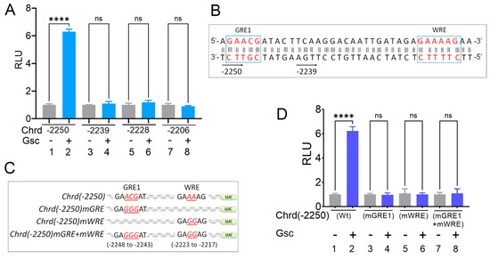 Figure 4. Site-directed mutagenesis of GRE1 and WRE within the chrd promoter completely abolishes Gsc-mediated transcriptional activation. (A) Relative luciferase activity of serially deleted chrd promoter constructs with or without Gsc. (B) Chrd promoter (-2250 to -2214 bps)with highlighted GRE1 and WRE (dotted boxes). The bottom arrowhead indicates the sequences of chrd(-2250) and chrd(-2239) reporter constructs. (C) Schematic representation of the site-directed mutagenesis scheme; targeted nucleotides are shown in italics and red. (D) Relative luciferase activity of chrd(-2250)mGRE1 and chrd(-2250)mWRE constructs with or without Gsc. **** p ≤ 0.0001, and n.s. denotes nonsignificant values.