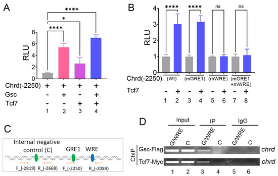 Figure 5. Tcf7 binds to WRE to activate chrd transcription. (A) Relative luciferase activity of chrd(-2250) promoter constructs with Gsc and Tcf7. (B) Relative luciferase activity of chrd(-2250)mGRE1 and chrd(-2250)mWRE constructs with Tcf7. (C) Schematic representation of designing the ChIP-PCR primer for GRE, WRE, and the internal negative control. (D) Chromatin immunoprecipitation (ChIP) assay was performed to test the occupancy of Gsc-Flag and Tcf7-Myc to GRE/WRE within the promoter region of chrd. * p ≤ 0.1, **** p ≤ 0.0001, and n.s. denotes nonsignificant values.