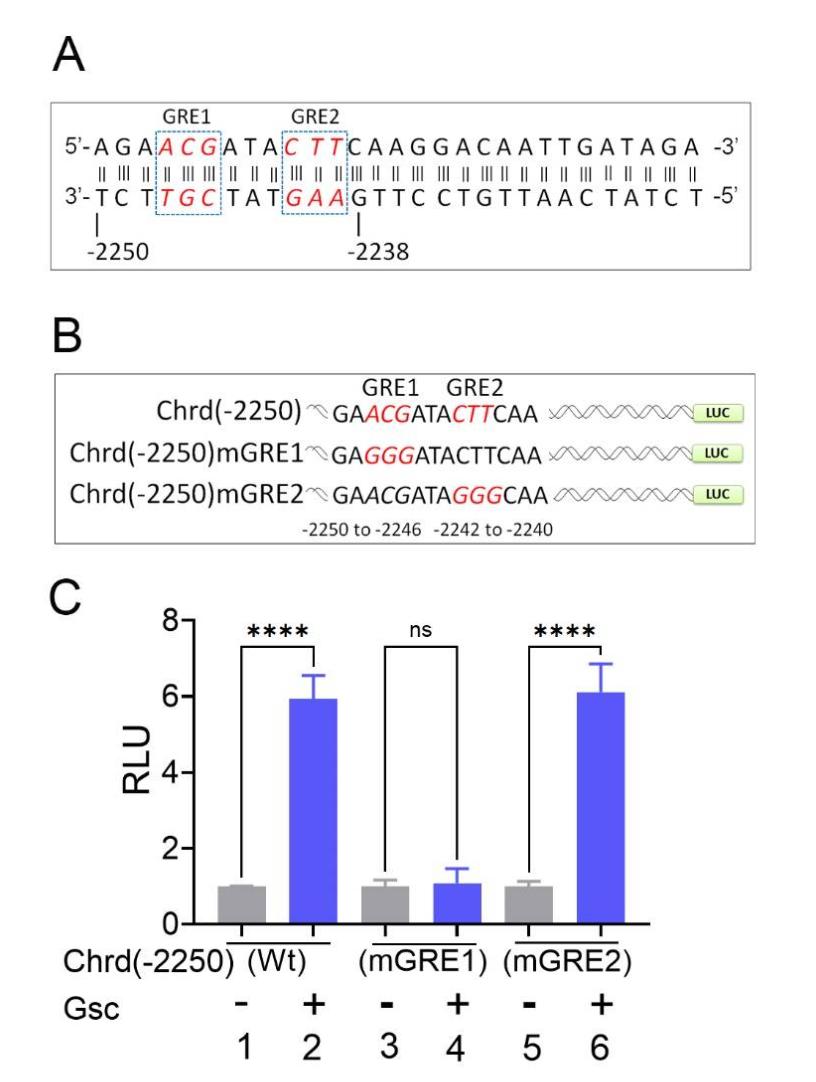 Figure S2. Identification of GRE1 within the chrd promoter. (A and B) The systematic representation of two targeted point mutations (namely GRE1 and GRE2, shown in the dotted box) was generated by site-directed mutagenesis in the upstream 11 bp (from -2250 to -2239) within the chrd promoter. (C) The mutated chrd(-2250)mGRE1, chrd(-2250)mGRE2, and wild-type chrd(-2250) promoter constructs were then injected with and without gsc mRNA at the one-cell stage. The relative luciferase activity was measured at stage 11.