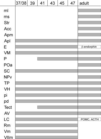 Figure 9. Timetable of appearance of α-MSH-positive cell groups (shaded bars) from rostral to caudal in the brain of Xenopus laevis during development (this study) compared with the situation in adults (data from Tuinhof et al., 1998). In adult animals, the epiphysis (E) and the locus coeruleus (LC) are α-MSH-negative but are immunoreactive for POMC (LC) and other POMC-derived peptides (β-endorphin in E, ACTH in LC). For other abbreviations , see list.