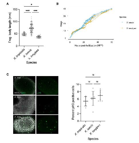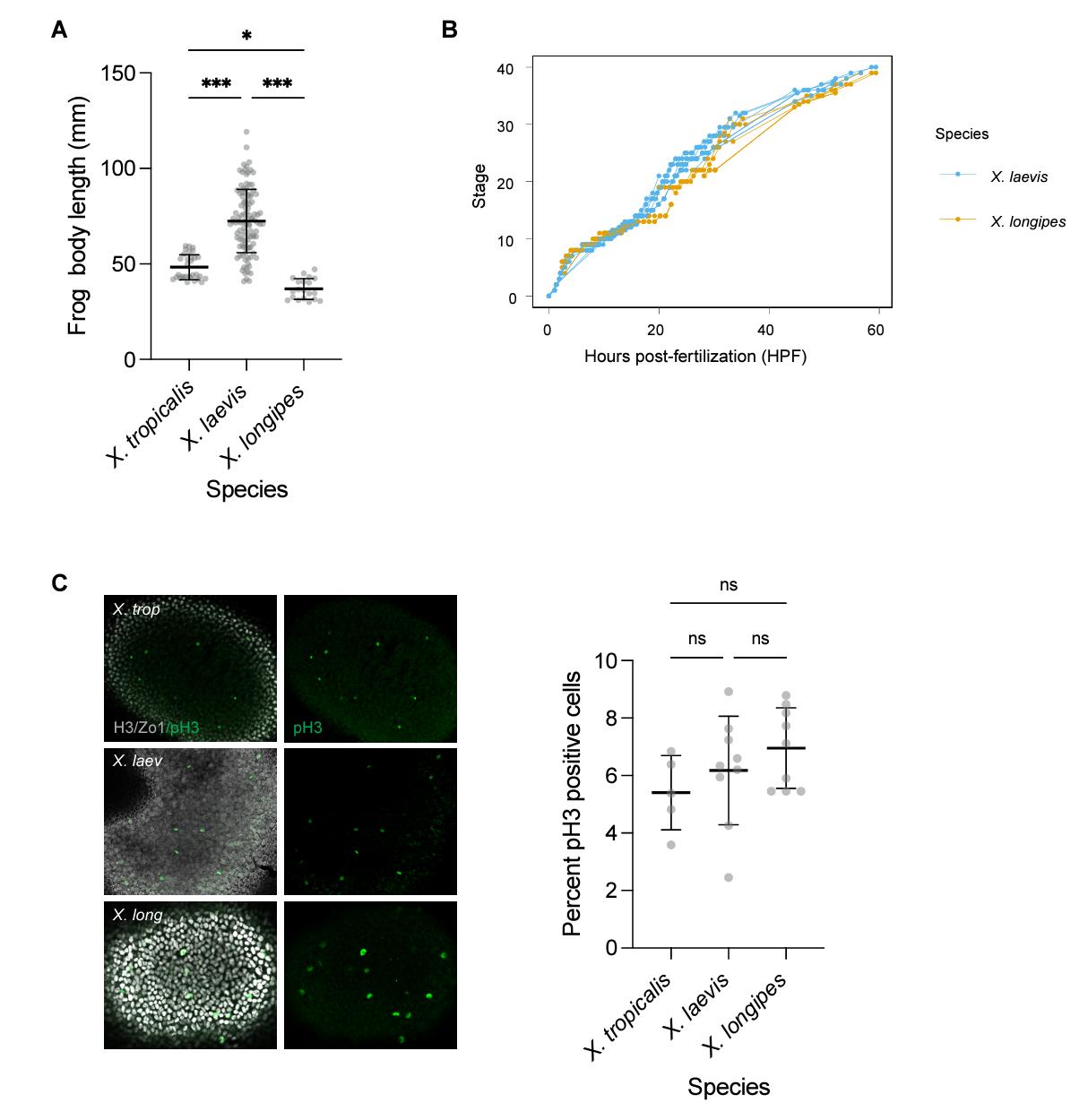 Figure S1. X. longipes body length and further development characterization. Related to Figure 1 (A) Snout to vent length plotted for male and female adult X. tropicalis, X. laevis, and X. longipes frogs. n=21 X. longipes measured. Lengths of X. tropicalis (n=38) and X. laevis (n=110) are from S1 . *p<0.05, ***p<0.001, determined by two-tailed t-test. (B) Developmental time course in X. longipes vs X. laevis, without smoothened line, showing individual timepoints. (C) Immunofluorescence staining of stage 21 X. tropicalis, X. laevis, and X. longipes embryos to assess the fraction of mitotic cells in each species. Cell borders (stained for tight junction marker ZO-1) and nuclei (stained for histone H3) are shown in gray. Dividing cells are stained with M-phase marker phospho-H3 (pH3). Quantification shows percent of pH3- positive cells in each species. Thick line in the middle of each set of points = mean, error bars= +/- std dev. ns= not significant p>0.05, determined by twotailed t-test. |