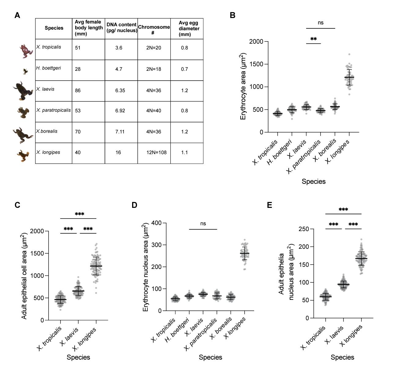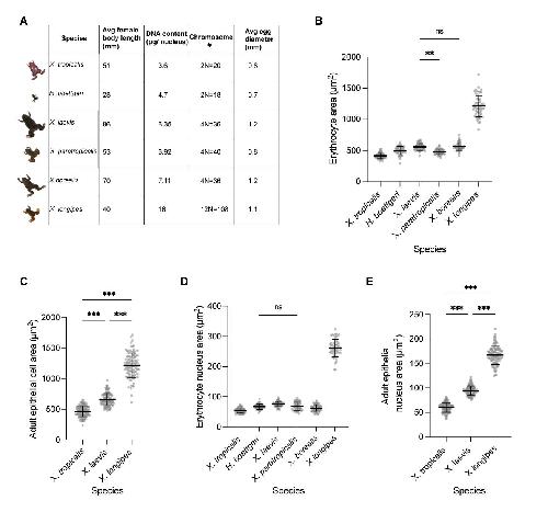 Figure S2. Measurements of cells and nuclei in adult Pipid frog species. Related to Figure 2 (A)Characteristics of frog species used for erythrocyte measurements. (B)Cross-sectional cell area of erythrocytes from adult frog species described in S1A. All P-values between species are <0.001 (not shown), except where indicated as not significant (p>0.05, ns) or (p<0.005,**) determined by two-tailed t-test. (C)Cross-sectional cell area of epithelial cells from adult X. tropicalis, X. longipes, and X.laevis. (D)Cross-sectional nucleus area of erythrocytes from adult frog species described in S1A. All p-values between species are <0.001 (not shown), except where indicated as not significant (ns) determined by two-tailed t-test. (E)Cross-sectional nucleus area of epithelial cells from adult X. tropicalis, X. longipes, and X. laevis. For plots in B-E, thick line in the middle of each set of points = mean, error bars = +/- std dev. ***p<0.001. For erythrocytes, n≥50 cells and nuclei were measured in each species. For epithelia, n≥100 cells and nuclei were measured in each species. |