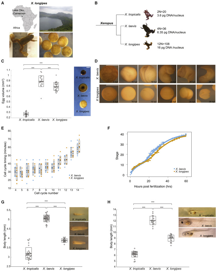 Figure 1. X. longipes morphometrics and development compared with other Xenopus species (A) Map28 and photograph19 of Lake Oku in Cameroon, Africa, and images of X. longipes frog and blastula stage embryos. Scale bars, 1 mm. (B) Phylogeny of X. longipes compared with X. laevis and X. tropicalis, with chromosome number and nuclear DNA content. See also Figure S1A for frog body length comparison. (C) Calculated egg volume in X. tropicalis, X. laevis, and X. longipes. n ≥ 23 eggs measured in each species. Scale bars, 0.5 mm. (D) Images of development in X. longipes versus X. laevis at 23°C. hpf, hours post fertilization. Scale bars, 1 mm. (E) Comparison of cell-cycle timing in animal pole cells of X. longipes versus X. laevis through the first 14 cleavage divisions. Each point represents the average timing for 3 individual cells. Thick line inside box indicates average time, and upper and lower box boundaries indicate ±SD. n = 3 cells from 10 total embryos analyzed per species from 3 separate clutches. p > 0.5 between species in each cell cycle, determined by two-tailed t test. (F) Developmental time course in X. longipes versus X. laevis at 23°C, 0–62 hpf. n = 3 clutches analyzed for X. laevis, n = 2 for X. longipes, 1–3 replicates for each clutch. See also Videos S1 and S2 and Figure S1B for individual time points. (G) Body length quantification of stage 36 tail-bud embryos in X. tropicalis, X. laevis, and X. longipes. n ≥ 20 tadpoles from 3 clutches measured for each species. Scale bars, 1 mm. (H) Body length quantification of stage 48 tadpoles in X. tropicalis, X. laevis, and X. longipes. n ≥ 20 tadpoles from 3 separate clutches measured for each species. Scale bars, 1 mm. For all boxplots, thick line inside box indicates average length, and upper and lower box boundaries indicate ±SD. ∗∗∗p < 0.001, determined by two-tailed t test. |