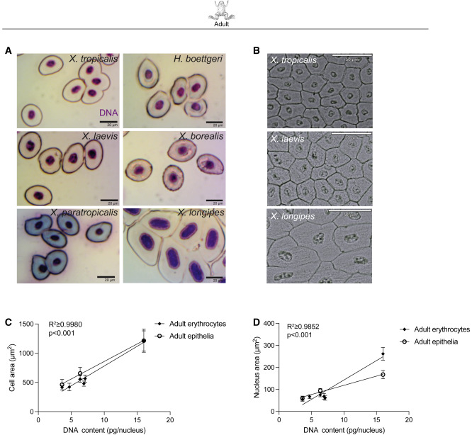 Figure 2. Scaling of cells and nuclei in adult pipid frog species (A) Images of erythrocytes from 5 adult pipid frog species of varying ploidies. See Figure S2A for details about species, including DNA content. Scale bars, 20 μm. (B) Images of adult epithelial cells from X. tropicalis, X. laevis, and X. longipes. Scale bars, 50 μm. (C) Average cell cross-sectional area in adult erythrocytes and epithelia as a function of genome size for each frog species. Five pipid frog species are plotted for erythrocytes; X. tropicalis, X. laevis, and X. longipes are plotted for epithelial cells. R2 ≥ 0.9980 for both erythrocytes and epithelia. See Figures S2B and S2C for distributions and Figure S3C for correlation and slope coefficients of each trend line. (D) Average nucleus cross-sectional area in adult erythrocytes and epithelia as a function of genome size for each frog species. Five pipid frog species are plotted for erythrocytes; X. tropicalis, X. laevis, and X. longipes are plotted for epithelial cells. R2 ≥ 0.9852 for both erythrocytes and epithelia. See Figures S2D and S2E for distributions and Figure S3F for correlation and slope coefficients of each trend line. For plots in (C) and (D), error bars indicate ±SD. |