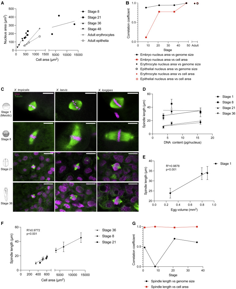Figure 4. Subcellular scaling of nuclei and spindles through development (A) Average cross-sectional nucleus area in X. tropicalis, X. laevis, and X. longipes embryos and adults, plotted as function of cell area. (B) Summary of correlation coefficients of nucleus area versus genome size and cell area through development from Figure 3F and (A). (C) Images of meiotic and mitotic spindles in X. tropicalis, X. laevis, and X. longipes embryos, stage 1 (unfertilized meiotic) through stage 36. Scale bars, 20 μm. Histone H3 staining indicates DNA. (D) Average spindle length plotted as a function of genome size in X. tropicalis, X. laevis, and X. longipes embryos. See Figure S4B for correlation and slope coefficients of each trend line and Figure S4C for distributions. (E) Average egg spindle length (stage 1, meiotic) plotted as a function of egg volume. See Figure S4C for distribution. (F) Average spindle length plotted as a function of cell area in X. tropicalis, X. laevis, and X. longipes embryos. See Figure S4C for distribution and Figure S4D for correlation and slope coefficients of each trend line. (G) Summary of correlation coefficients of spindle length vs. genome size or cell area through development from (D)–(F). For all plots, error bars indicate ±SD. |
