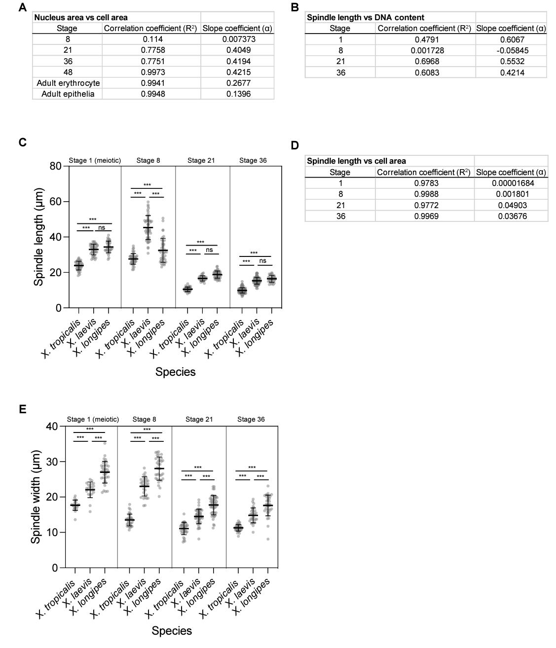 Figure S4. Spindle length and width in X. tropicalis, X. laevis, and X. longipes embryos. Related to Figure 4 (A) Correlation and slope coefficients of nucleus area vs cell area from linear trendlines in Fig. 4A. Correlation coefficients for linear trendlines (R2) were calculated from the Pearson’s Correlation Coefficient (R). (B) Correlation and slope coefficients of spindle length vs genome size from linear trendlines in Fig. 4D. (C) Spindle length (measured as pole-to-pole distance) through development including Stage 1 (unfertilized meiotic). Thick line in the middle of each set of points=mean. Error bars= +/- std dev. ***p<0.001, ns= not significant, determined by two-tailed t-test. n≥34 spindles from >3 eggs/embryos from ≥3 clutches measured for each species per stage (D) Correlation and slope coefficients of spindle length vs cell area from linear trendlines in Fig. 4F. n ≥20 metaphase plates from ≥3 clutches measured for each species per stage. (E) Spindle width (measured as metaphase plate length) through development including Stage 1 (meiosis II). Thick line in the middle of each set of points=mean. Error bars= +/- std dev. ***p<0.001, determined by two-tailed t-test. |