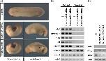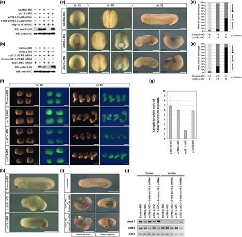 Figure 6. Knockdown effects of Ccl19.L and Ccl21.L on morphogenesis and differentiation. (a and b) Results of western blot analysis. Indicated reagents were injected. hbg1-MYC mRNA was co-injected as the loading control. Specificity of ccl19.L-MO (a) and ccl21.L-MO (b). (c) Phenotypes of embryos after injection with ccl19.L- and ccl21.L-MO into two dorsal blastomeres at the four-cell stage. The developmental stages are indicated in the upper panels. Vegetal view (st. 12), dorsal view (st. 18), lateral view (st. 28). In the stage 18 images of morpholino oligonucleotide (MO)-injected embryos, which were affected in neural fold closure, the left panels show a representative example of the weak phenotypes with delaying neural fold closure and the right panels show a representative example of the severe phenotype of embryos whose neural folds were wide open. In the stage 28 images of MO-injected embryos, which had no head structure, the left panels show a representative example of the weak phenotypes with normal trunk axes and the right panels show a representative example of the severe phenotype with short and bending axes. Bars, 0.5 mm. (d and e) The appearance rates of phenotypes (st. 28) in Figure 6c. Normal phenotype (light gray), weak phenotype (dark gray), and severe phenotype (black) are shown. Injected MO amounts are indicated at the bottom of the graph. (d) ccl19.L-MO-injected embryos. Lane 1: n = 57, normal (94.7%), weak (5.3%), and severe (0%). Lane 2: n = 54; normal (3.7%), weak (88.9%), and severe (7.4%). Lane 3: n = 55; normal (0%), weak (54.5%), and severe (45.5%). (e) ccl21.L-MO-injected embryos. Lane 1: n = 57; normal (94.7%), weak (5.3%), and severe (0%). Lane 2: n = 57; normal (0%), weak (77.2%), and severe (22.8%). Lane 3: n = 58; normal (0%), weak (12.1%), and severe (87.9%). (f) Keller sandwich explants of embryos injected dorsally with ccl19.L-, ccl21.L-, or ccr7.S-MO (30, 15, or 20 ng/blastomere, respectively). Upper panels indicate the stages of time-control embryos. Right images are fluorescence images of the explants. Injection of ccl19.L- and ccr7.S-MO only marginally affected convergent extension cell movements. In contrast, injection of ccl21.L-MO severely inhibited convergent extension cell movements. Bars, 0.5 mm. (g) Length-to-width ratio of Keller sandwich explants (st. 25). The length of the bending parts of the explants was measured along the axial elongation. The longest axis of each explant was divided by its widest perpendicular aspect except for the epidermal ectoderm region. Eight explants were measured in each category. (h) Phenotypes of the ventrally ccl19.L- and ccl21.L-MO-injected embryos (st. 28). All injected embryos had ventral gastrulation defects (n = 45, ccl19.L-MO injection, and n = 44, ccl21.L-MO injection). Bars, 1.0 mm. (i and j) Data of rescue experiments by co-injection with each mRNA (5-mis-ccl19.L mRNA, 1000 pg/blastomere, or 5-mis-ccl21.L mRNA, 500 pg/blastomere) and each MO (ccl19.L-MO, 30 ng/blastomere, or ccl21.L-MO, 15 ng/blastomere). (i) Phenotypes of the dorsally and ventrally injected embryos (st. 28). Arrowheads indicate small secondary axis-like structures. All dorsally injected embryos showed severe gastrulation defects (n = 43, 5-mis-ccl19.L mRNA + ccl19.L-MO-injection, and n = 42, 5-mis-ccl21.L mRNA + ccl21.L-MO-injection). All ventrally injected embryos showed ventral gastrulation defects with very small axis-like structures (n = 44, 5-mis-ccl19.L mRNA + ccl19.L-MO-injection, and n = 45, 5-mis-ccl21.L mRNA + ccl21.L-MO-injection). Bars, 1.0 mm. (j) RT-PCR analysis of the dorsal or ventral sectors of each mRNA- and MO-co-injected embryo (st. 10). |