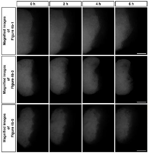 Highly magnified images of the red labeled ventral mesodermal sector of Figure 4b-1, b-3, b-5 are indicated in the top, center, and bottom panels, respectively. The elapsed time is indicated at the top. Bars, 0.5 mm. |