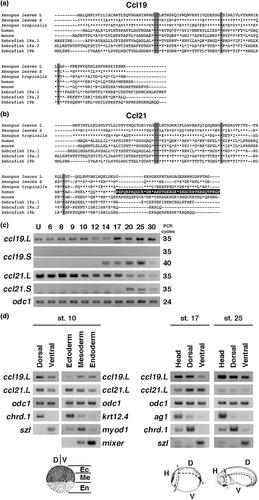 Figure 1. Alignment of Ccl19 and Ccl21 and expression patterns of ccl19 and ccl21. (a and b) Alignment of Xenopus laevis L, Xenopus laevis S, Xenopus tropicalis, human, mouse, and zebrafish Ccl19 (a) and Ccl21 (b). Asterisks (*) indicate conserved amino acids. The conserved cysteine residues are shaded gray. The positively charged 41 amino acids at the C-terminus of human Ccl21 are shaded black. (c and d) Expression patterns of ccl19 and ccl21. odc1 was used as an internal control. (c) Temporal expression patterns. U indicates unfertilized eggs and the numbers indicate developmental stages. (d) Spatial expression patterns. Indicated genes under odc1 were used as positive control markers for each germ layer and tissue. Dissections at several developmental stages were performed as shown in the bottom panels. D, dorsal; Ec, ectoderm; En, endoderm; H, head; Me, mesoderm; V, ventral. |