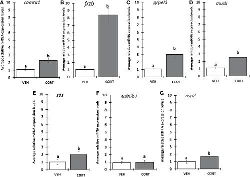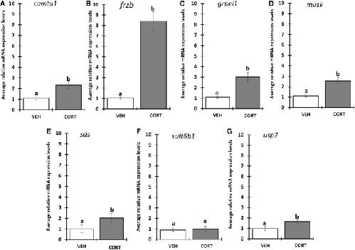 Figure 1. Evaluation of CORT response in selected genes. Premetamorphic tadpoles at Nieuwkoop and Faber stage 54 (NF54) were treated with vehicle control or 100 nM CORT (corticosterone) for 24 hours followed by tail RNA extraction and quantitative PCR to quantify mRNA expression using gene specific primers for (A) calmodulin binding transcription activator 1 (camta1), (B) frizzled related protein (frzb), (C) GrpE like 1, mitochondrial (grpel1) (D) muscle associated receptor tyrosine kinase (musk), (E) serine dehydratase (sds), (F) sulfotransferase family 6B member 1 (sult6b1), and (G) ubiquitin specific peptidase 2 (usp2). Bars represent mean mRNA levels relative to the housekeeping gene rpl8 and normalized to a vehicle control sample. n = 10 tail samples per treatment. Error bars represent SE. Letters indicate significant groups, p < 0.05. |