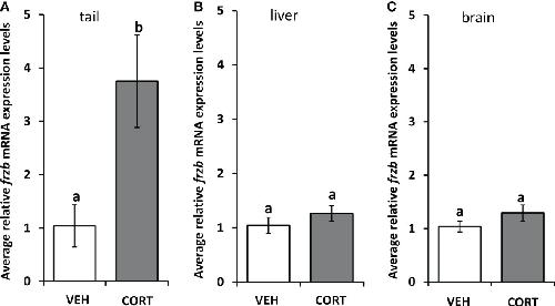 Figure 3. Tissue expression profile of frzb in tadpoles. Premetamorphic tadpoles (NF 54) were treated with vehicle and 100 nM CORT (corticosterone) for 24 hours. Tails (A), livers (B), and brains (C) were dissected, followed by RNA extraction and quantitative PCR to measure mRNA expression of frzb and the housekeeping gene rpl8. Bars represent mean mRNA levels relative to rpl8 and normalized to a vehicle control sample. n = 10 tail samples per treatment. Error bars represent SE. Letters indicate significant groups, p < 0.05. |