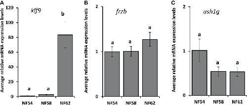 Figure 4. Developmental expression profile of klf9, frzb, and ush1g in tadpole tails throughout metamorphosis. Tails from tadpoles at the indicated NF stages were harvested, followed by tail RNA extraction and quantitative PCR to measure mRNA expression levels of klf9