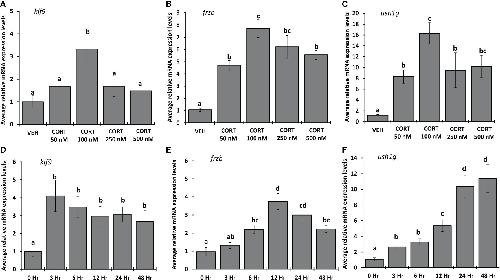 Figure 6. Dose response and time course for CORT induction of frzb, ush1g, and klf9 in tadpole tails. (A-C) Premetamorphic tadpoles (NF 54) were treated with vehicle and 50, 100, 250, and 500 nM of CORT (corticosterone) for 24 hours. (D-F) Premetamorphic tadpoles (NF 54) were treated with 100 nM CORT for 0, 3, 6, 12, 24, and 48 hours. Tails were dissected from tadpoles followed by RNA extraction and quantitative PCR to measure mRNA expression of frzb, ush1g, and klf9 and the housekeeping gene rpl8. Bars represent mean mRNA levels relative to rpl8 and normalized to a vehicle control sample. n = 10 tail samples per treatment. Error bars represent SE. Letters indicate significant groups, p < 0.05. |